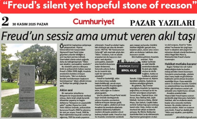 On 30 October 2025, the traditional Turkish quality newspaper Cumhuriyet (“The Republic”), the oldest newspaper still in circulation in Turkey, published an essay by Birol Kiliç from Vienna entitled “Freud’s quiet but hopeful stone of reason in Vienna and Turkey” in its section for prominent authors on page two. The article has been translated into both German(first) and English. Kiliç is the founder and editor of the newspapers Neue Heimat Zeitung, Türkische Allgemeine, and Neue Welt Verlag in Vienna.