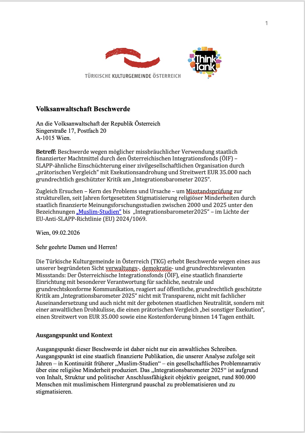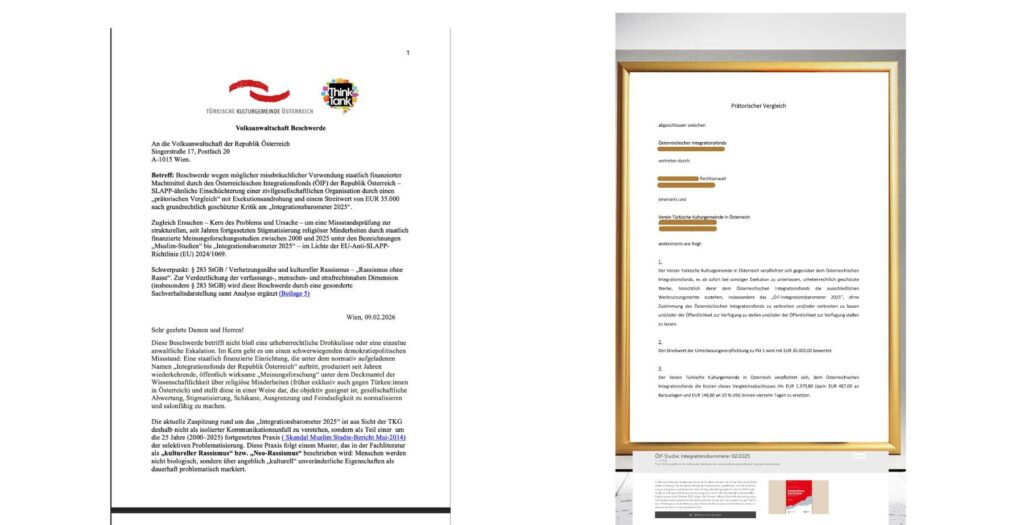 TKG Think Tank (Avusturya Türk Kültür Cemiyeti), ÖIF’in “Entegrasyon Barometresi 2025” (Integrationsbarometer 2025) yayınının azınlıklar üzerinde damgalayıcı etki ürettiğini ve eleştiriler sonrası sivil topluma karşı “stratejik dava yoluyla susturma” (SLAPP) benzeri bir hukuki baskı mekanizması işletildiğini savunarak Avusturya’nın resmi denetim kurumu Halk Denetçiliği’ne (Volksanwaltschaft) on yedi sayfagan oluşan yüksek Almanca ve hukuki bilgiler artı kaynaklarla dolu kapsamlı şikâyet başvurusu yaptı.