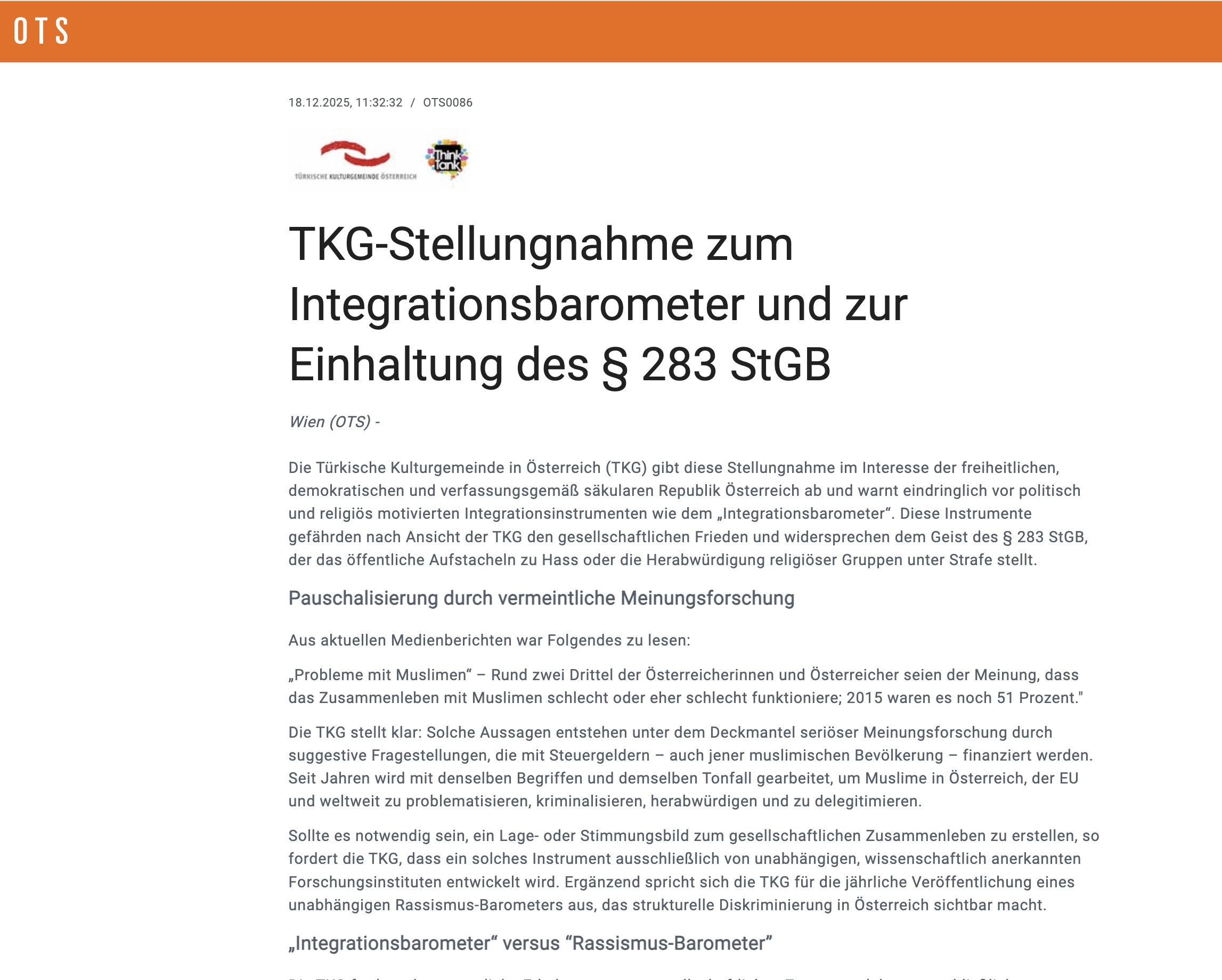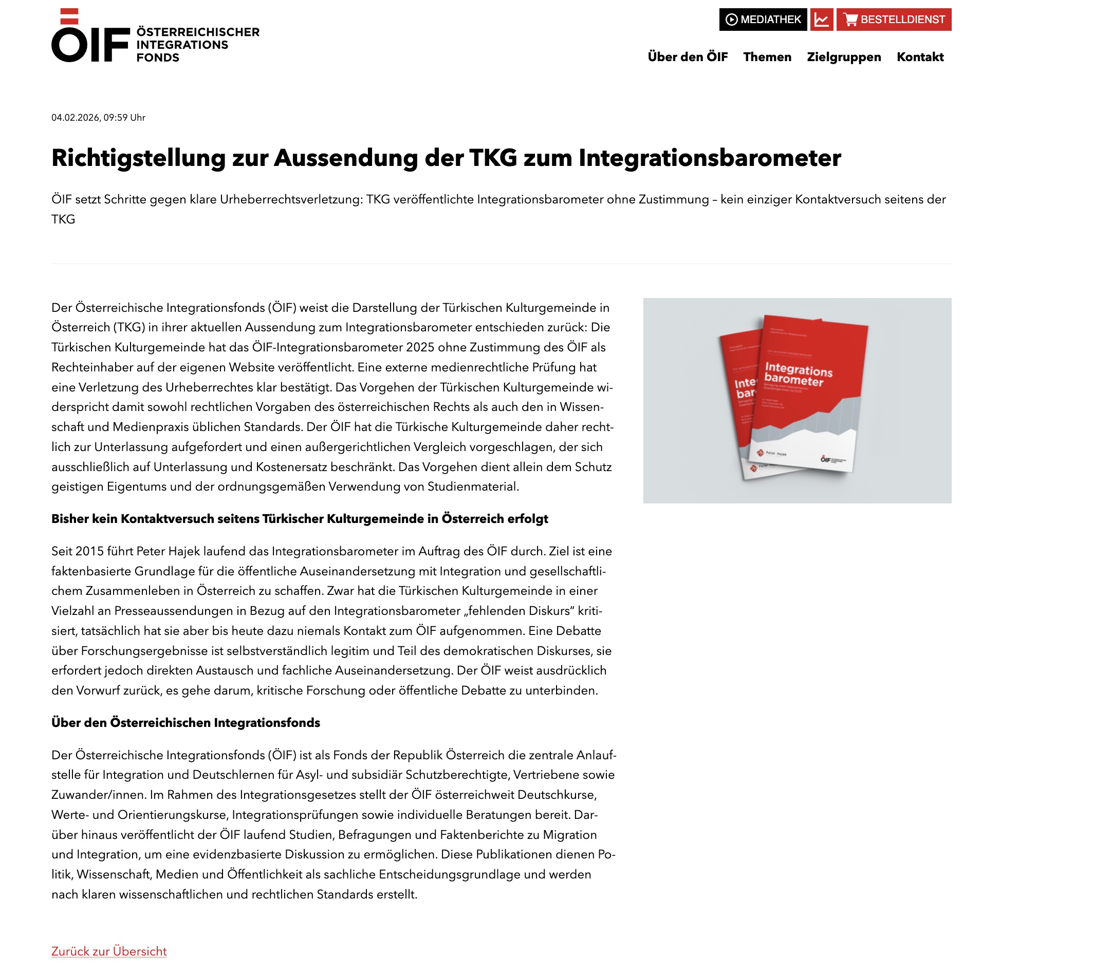 Avusturya Cumhuriyeti Entegrasyon Fonu (Österreichischer Integrationsfonds/ÖIF) 04.02.2026 tarihinde resmî internet sitesinde “Richtigstellung zur Aussendung der TKG zum Integrationsbarometer” (“TKG’nin entegrasyon barometresi ile ilgili açıklamasına ilişkin düzeltme“) başlıklı bir metin yayımladı.